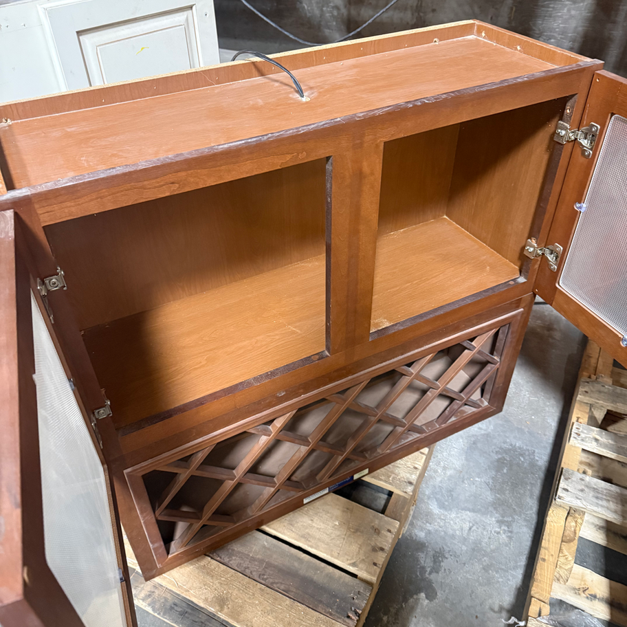 Beautiful old style cabinet. 35 1/2" wide x 33 1/4" x 12" deep. It has a small light fixture inside the top.