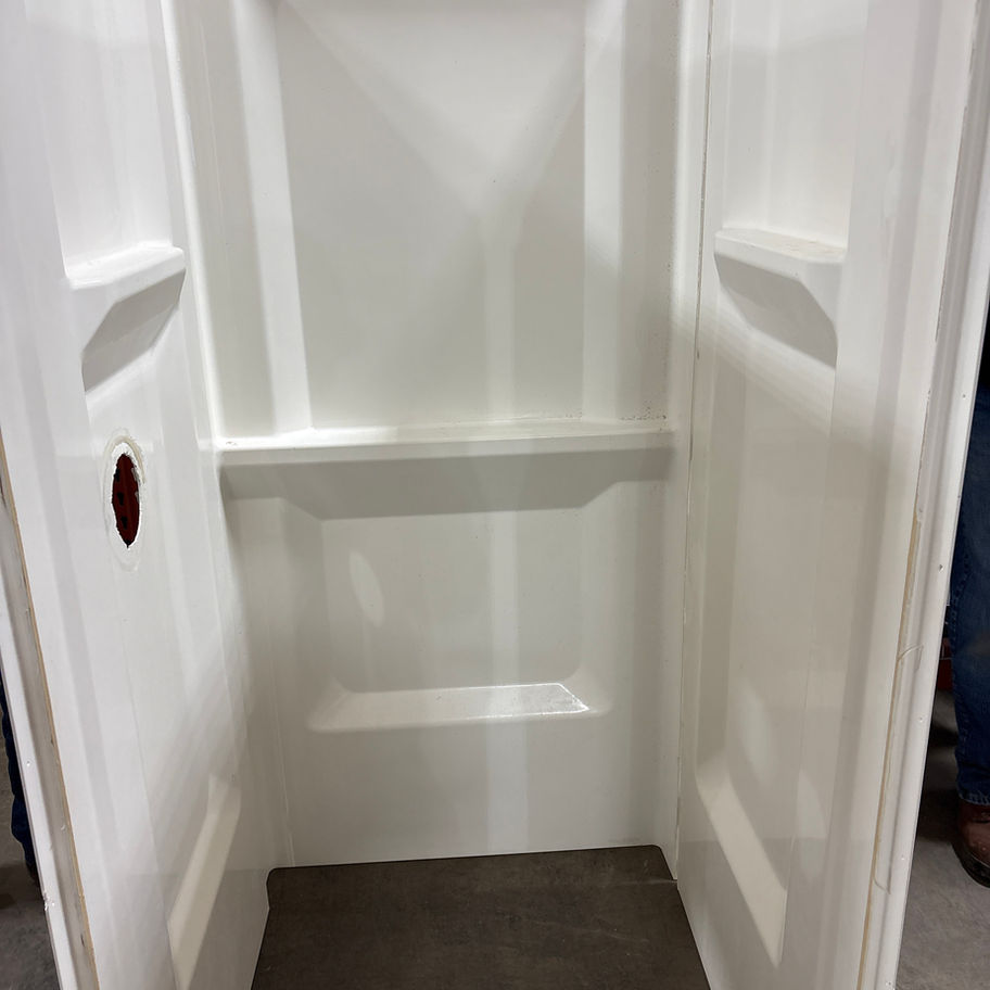 White fiberglass shower stall unit with integrated floor basin and drain opening. Designed to pair with Mustee shower wall panels. Ideal for bathroom remodels or replacement installs.